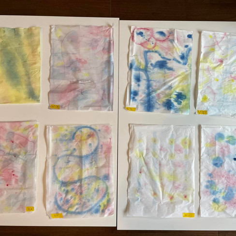 半紙や和紙に赤、青、黄いろの3色を垂らして色水遊び。
